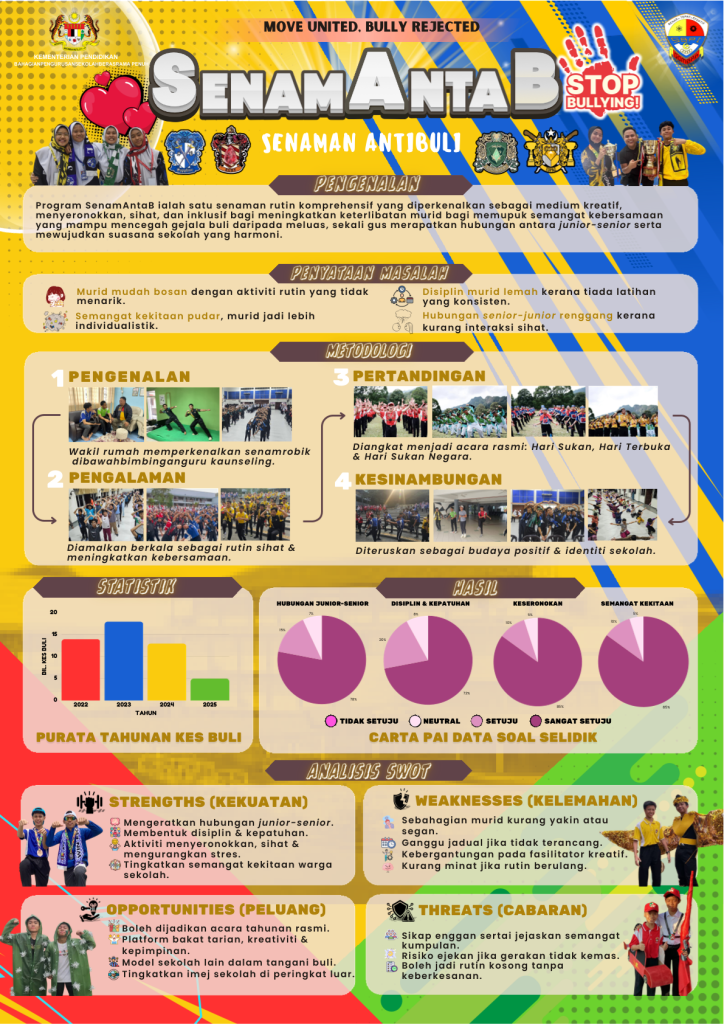 SenamAntaB is an anti-bullying initiative designed to promote unity, discipline, and positive interaction among students. The program introduces a structured and engaging aerobic routine that encourages participation from all students while strengthening the bond between juniors and seniors. Through this activity, students are able to stay active, develop teamwork, and foster a supportive school environment. SenamAntaB also serves as a creative approach to raise awareness about bullying and to build a culture of respect, inclusivity, and harmony within the school community. The program is carried out regularly as part of school activities and has grown to become an important platform for encouraging school spirit, cooperation, and healthy living. By combining physical activity with meaningful values, SenamAntaB helps create a safer and more positive learning environment for everyone.